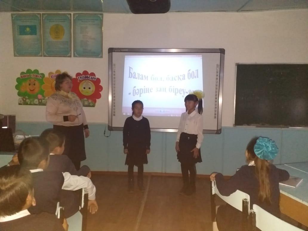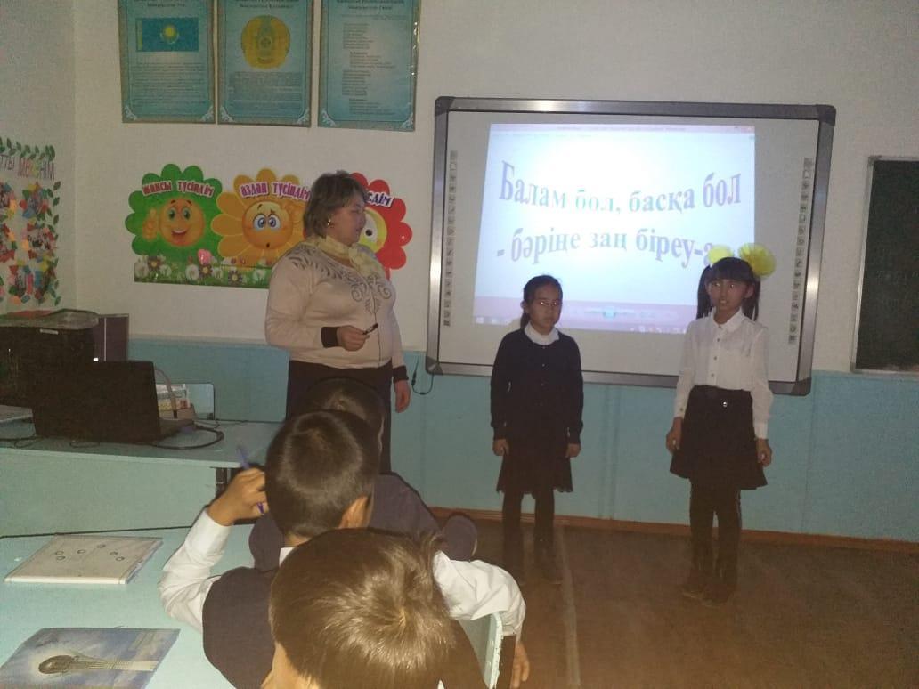 13 ноябрь 2019 20 1 2 3 4 5 "Балам бол, басқа бол-барлығыңа заң біреу-ақ" Жиенбет негізгі мектебінде 13-қараша күні бастауыш сыныптар арасында "Балам бол, басқа бол-барлығыңа заң біреу-ақ" тақырыбында сынып сағаты өткізілді.