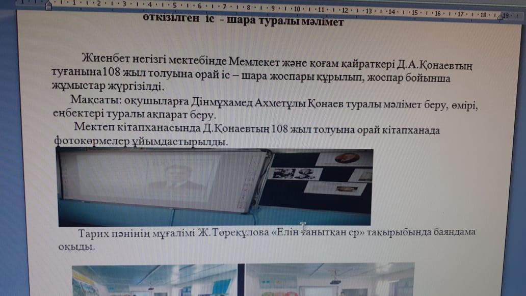 Жиенбет негізгі мектебінде Мемлекет және қоғам қайраткері Д.А.Қонаевтың туғанына 108 жыл толуына орай мектеп кітапханасында көрме ұйымдастырылды, тарих пәні мұғалімі Торекулова Жазира "Елін танытқан ер" тақырыбында баяндама оқыды,1-9 сыныптар арасында "Дана тұлға, дара тұлға " тақырыбында сыныптар сағаты өткізілді.
