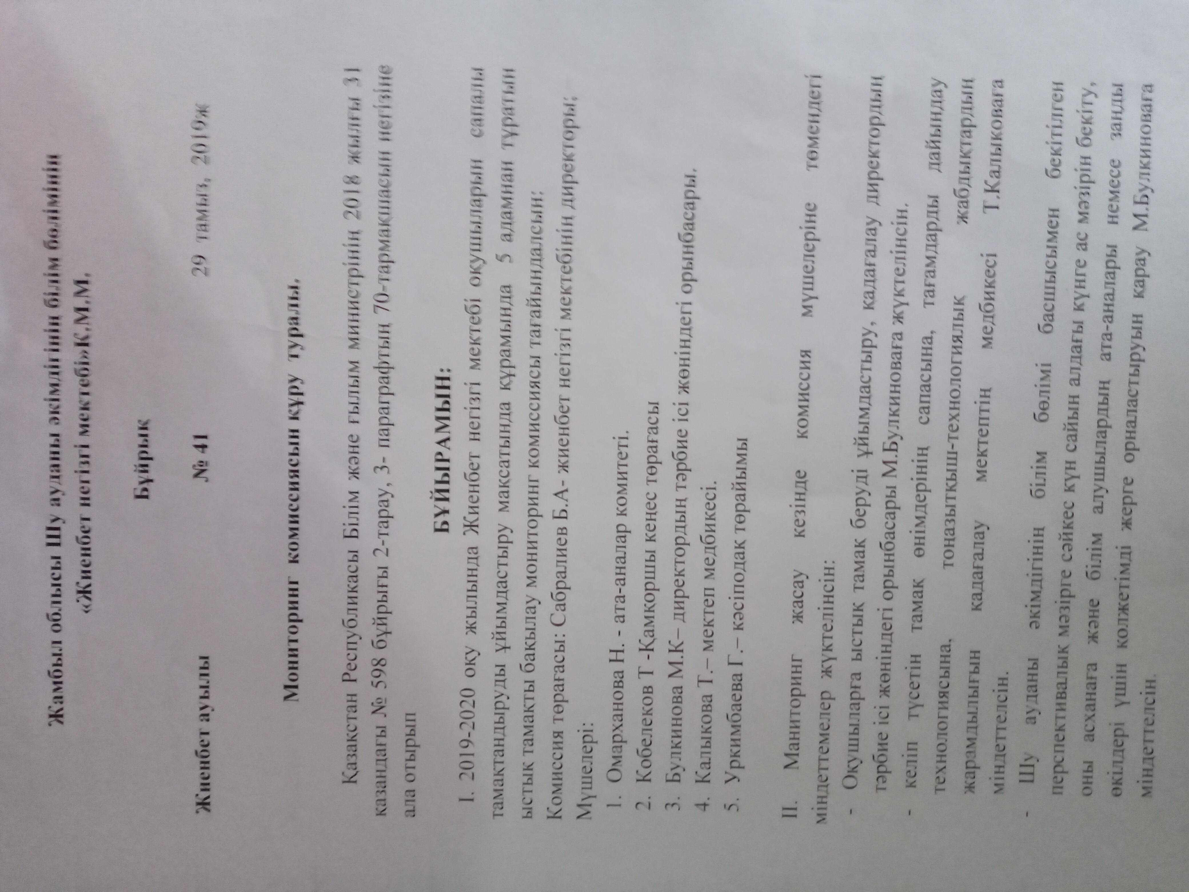 Мониторинг комиссиясын құру туралы бұйрық » Жиенбет негізгі мектебі