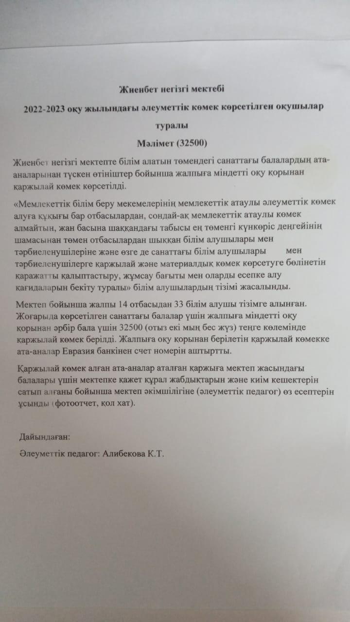 2022-2023 оқу жылындағы әлеуметтік көмек көрсетілген оқушылар туралы мәлімет » Жиенбет негізгі мектебі