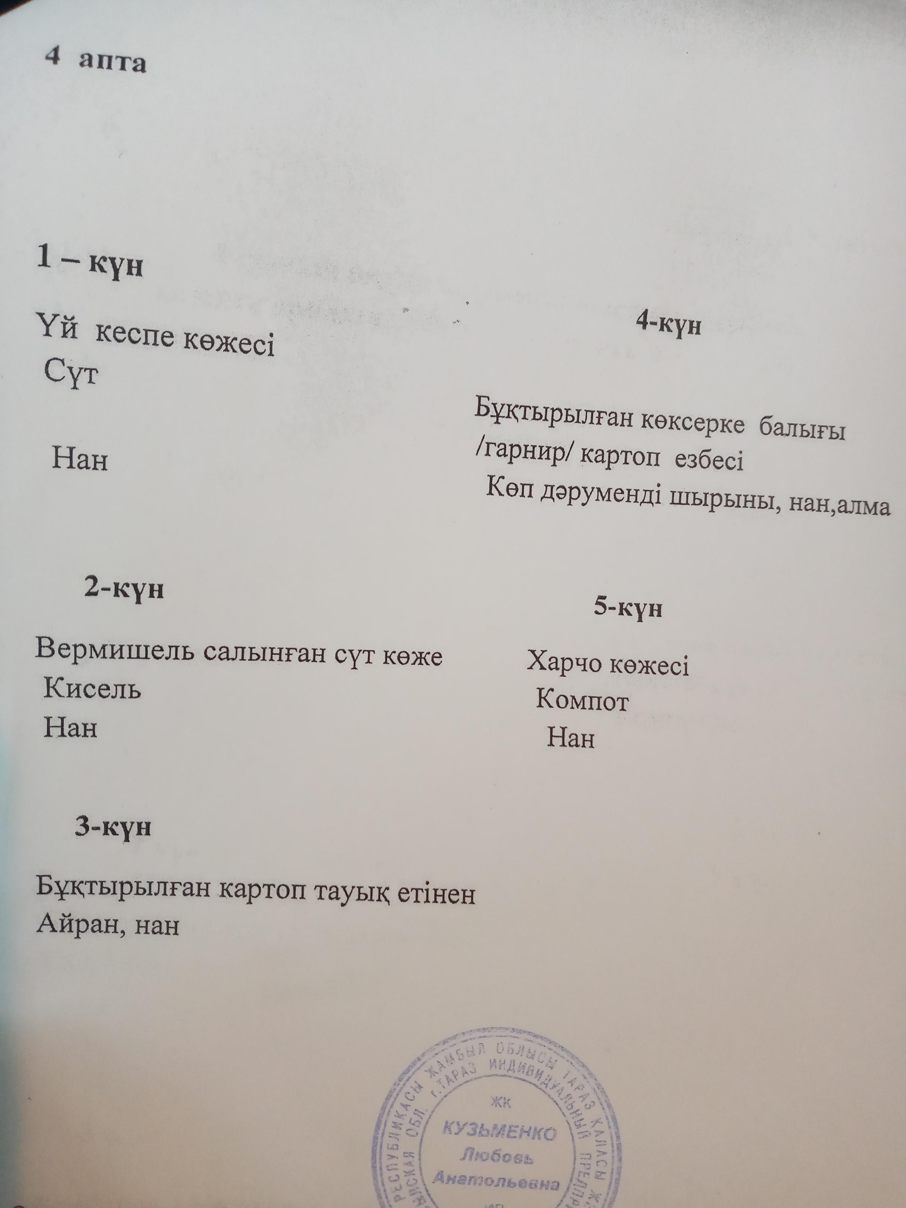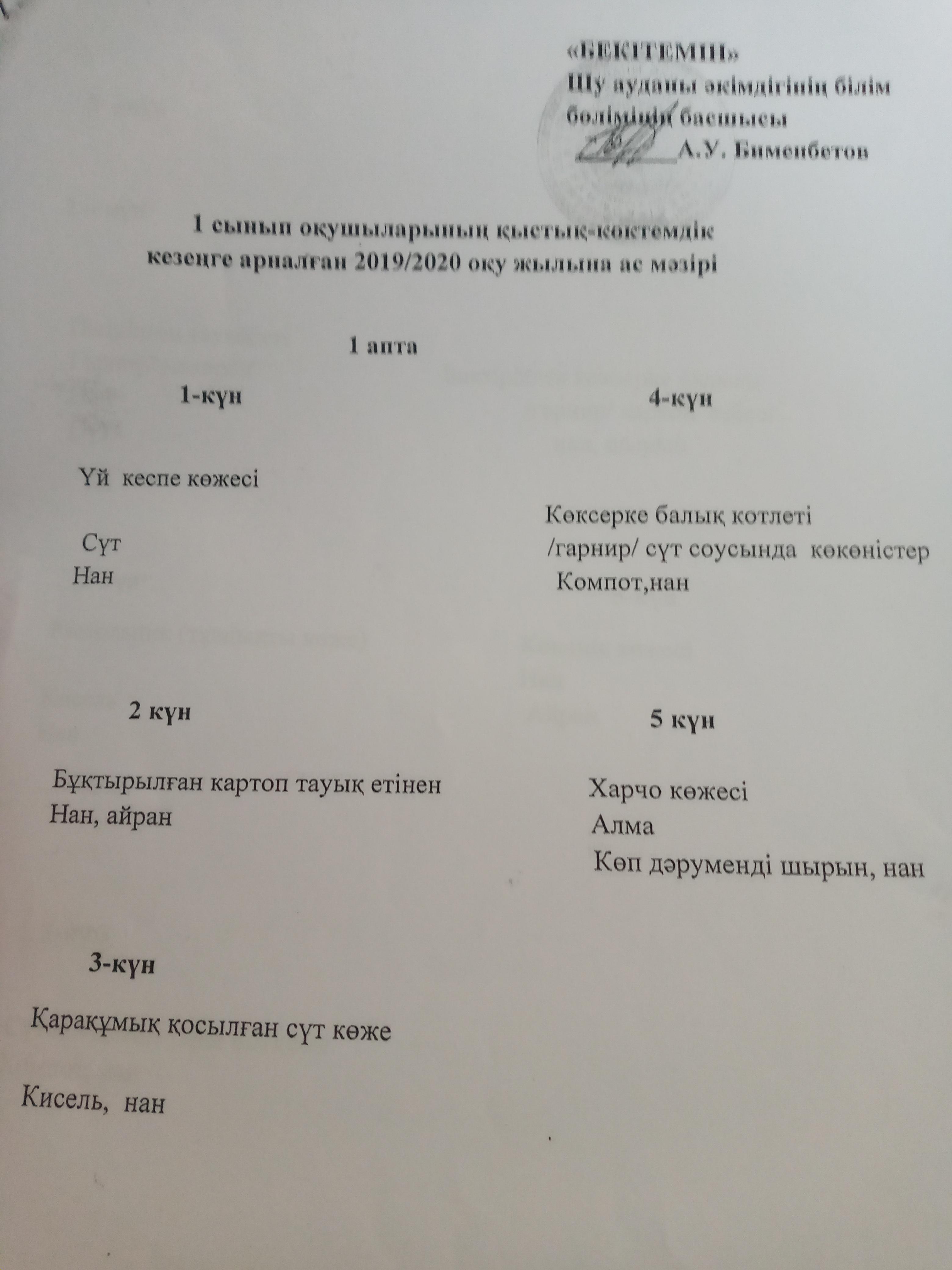 Жиенбет негізгі мектебінің 1 сынып оқушыларына қыстық-көктемдік кезеңге арналған 2019-2020 оқу жылына ас мәзірі