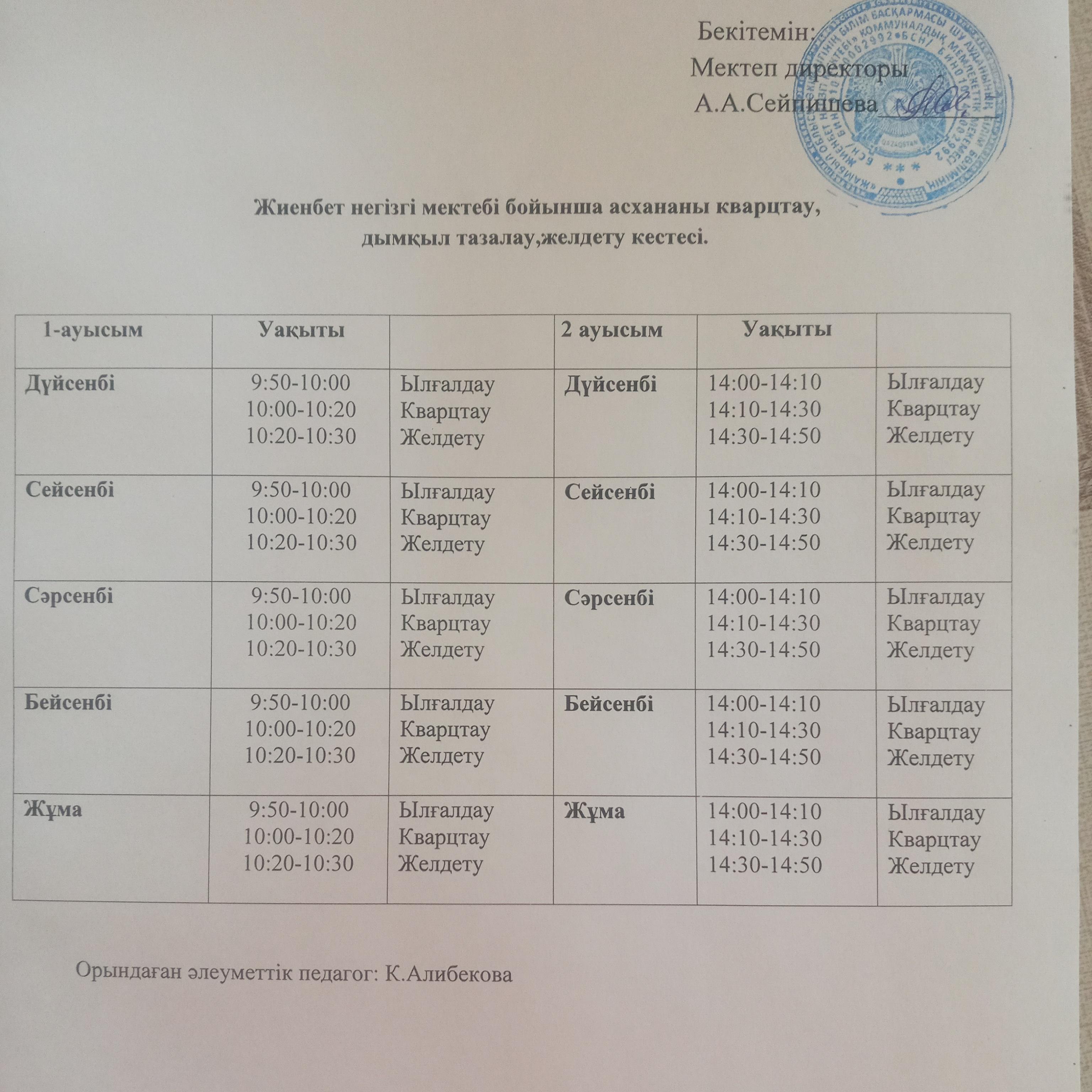 08 апрель 2021 0 1 2 3 4 5 Мектеп асханасы Жиенбет негізгі мектебі бойынша асхананы кварцтау,дымқыл тазалау,желдету кестесі.