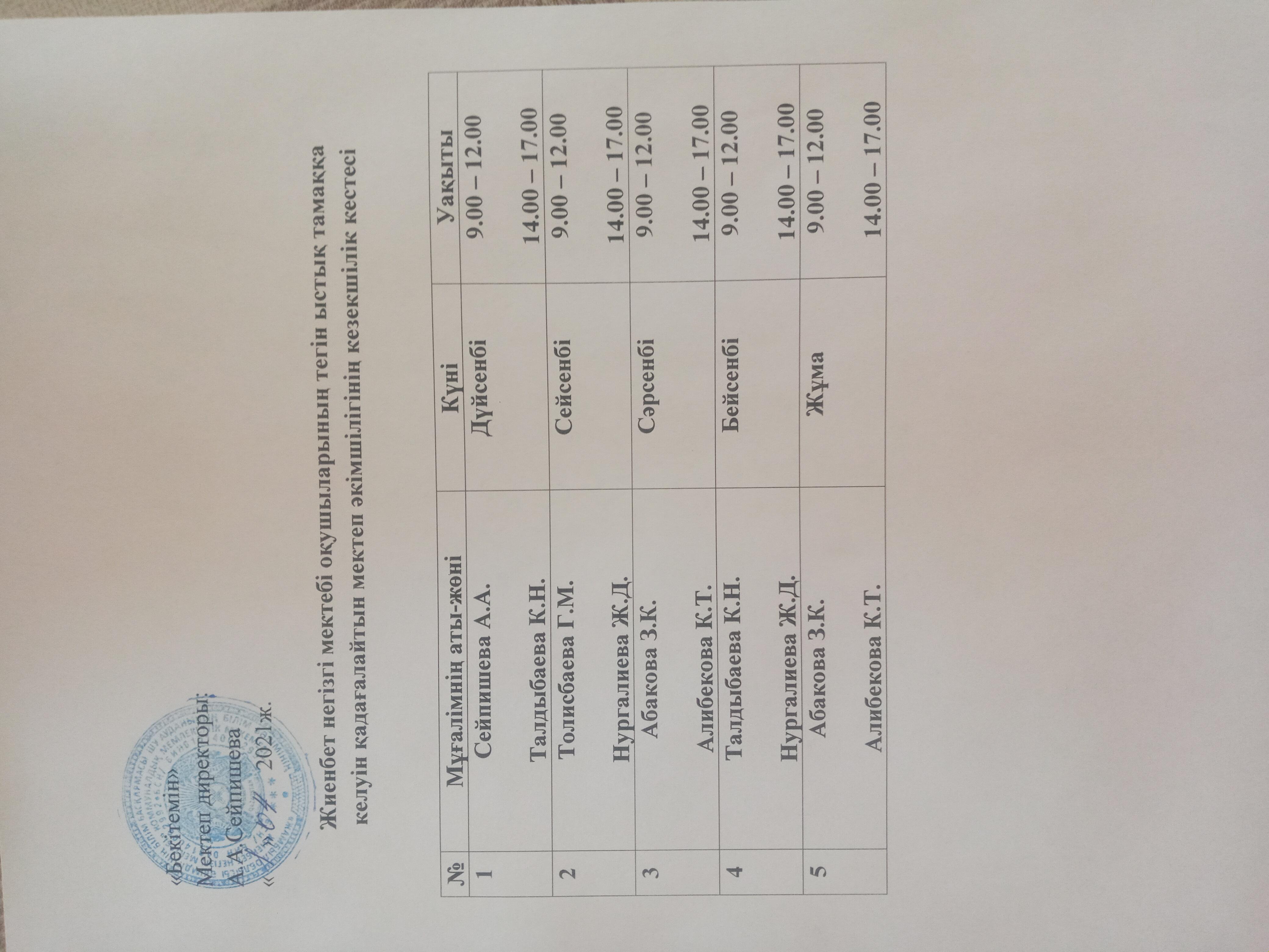 08 апрель 2021 0 1 2 3 4 5 Мектеп асханасы Жиенбет негізгі мектебі оқушыларының тегін ыстық тамаққа келуін қадағалайтын мектеп әкімшілігінің кезекшілік кестесі.