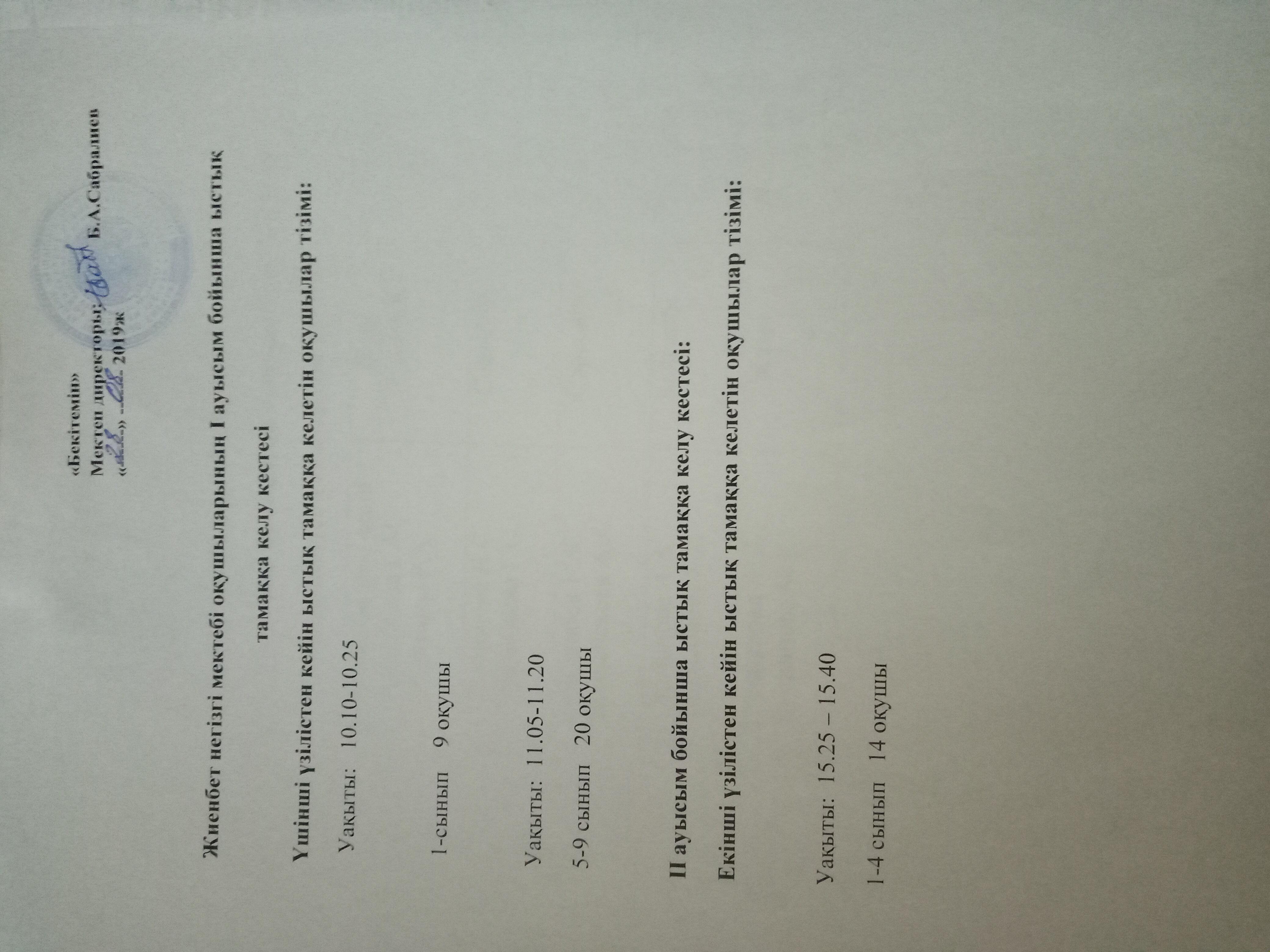 Жиенбет негізгі мектебі оқушыларының тегін ыстық тамаққа келу кестесі