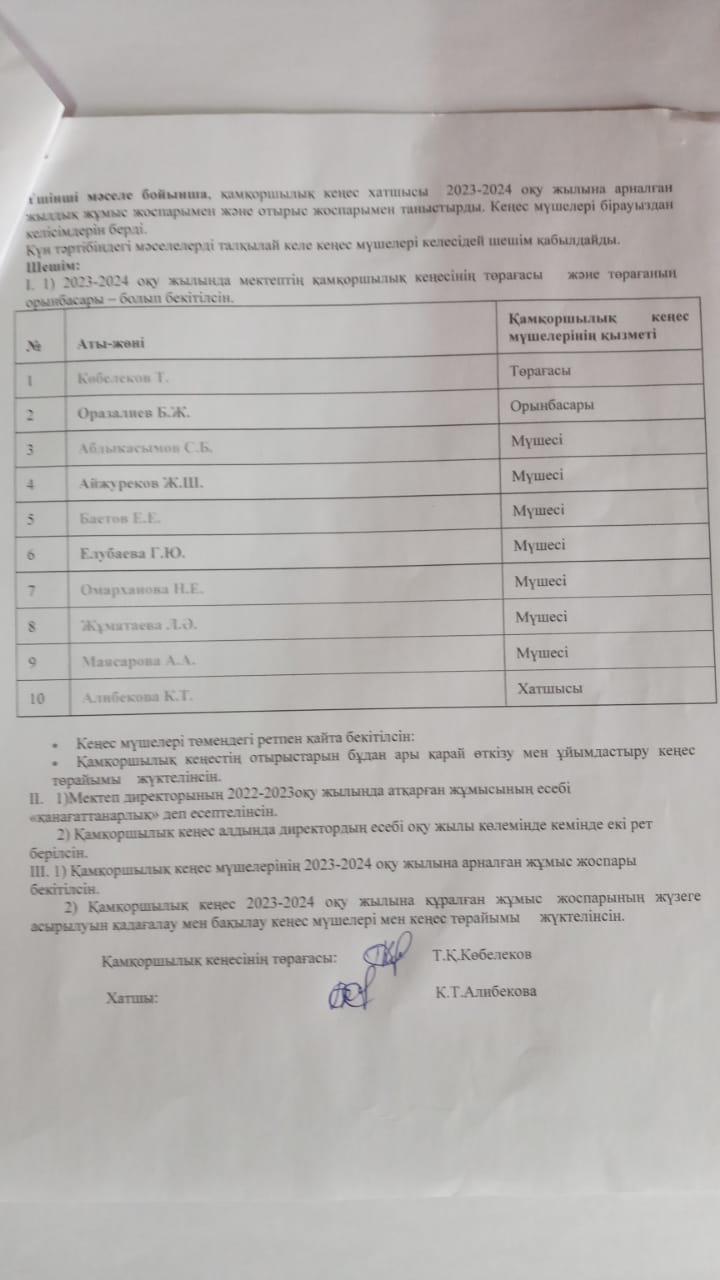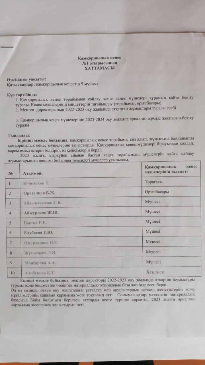 Попечительский совет отырысының №1 хаттамасы 2023-2024 оқу жылы » Жиенбет негізгі мектебі