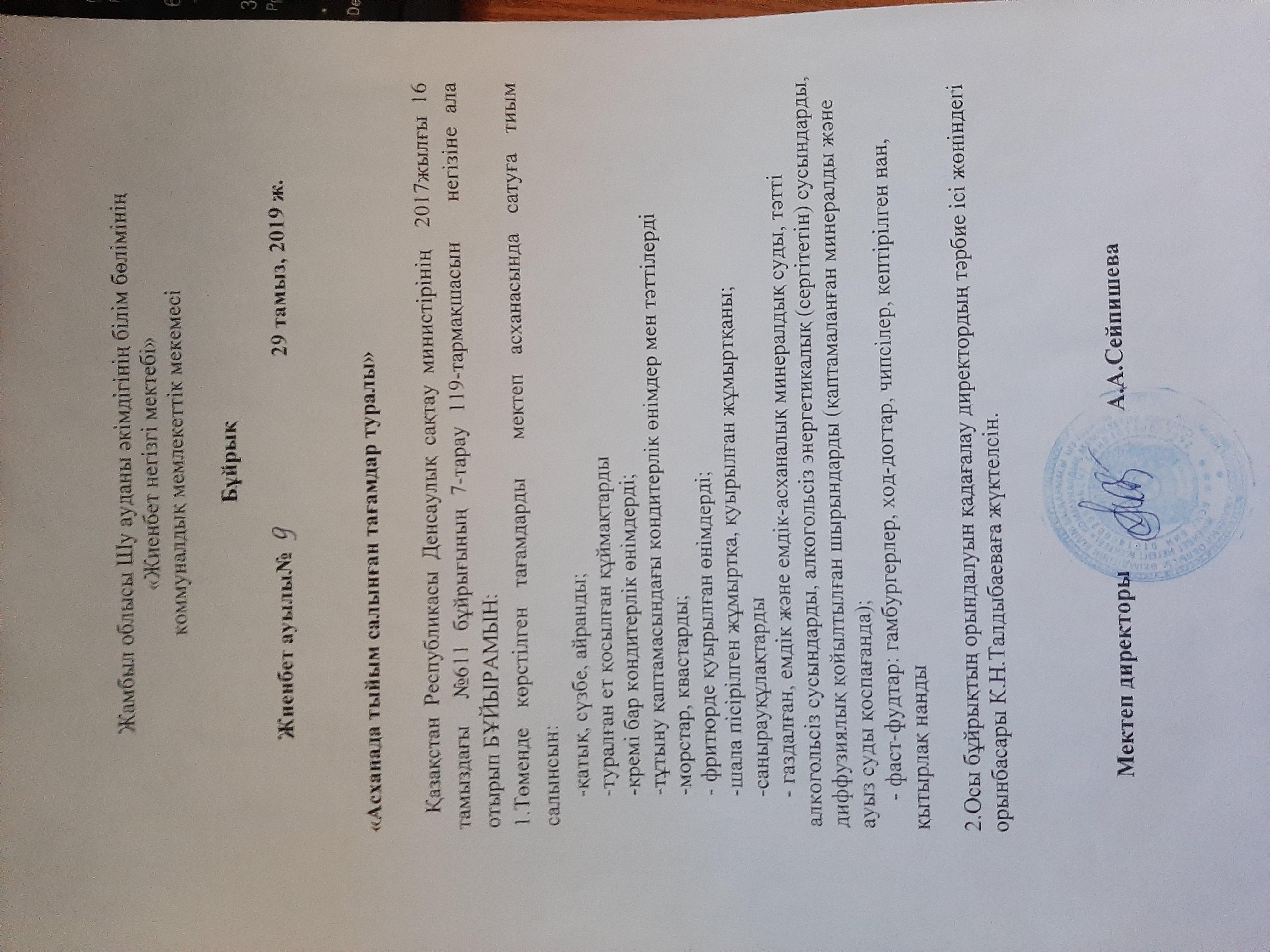 Асханада тыйым салынған тағамдар туралы бұйрығы » Жиенбет негізгі мектебі